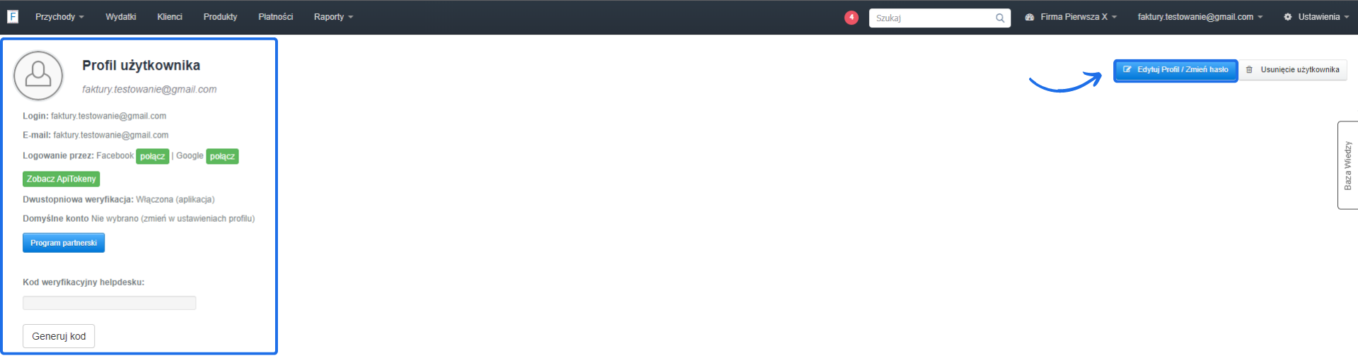 system wyświetli stronę, na której znajdziesz aktualne dane Twojego profilu takie jak e-mail, login, status dwustopniowej weryfikacji czy wygenerujesz kod weryfikacyjny helpdesku;