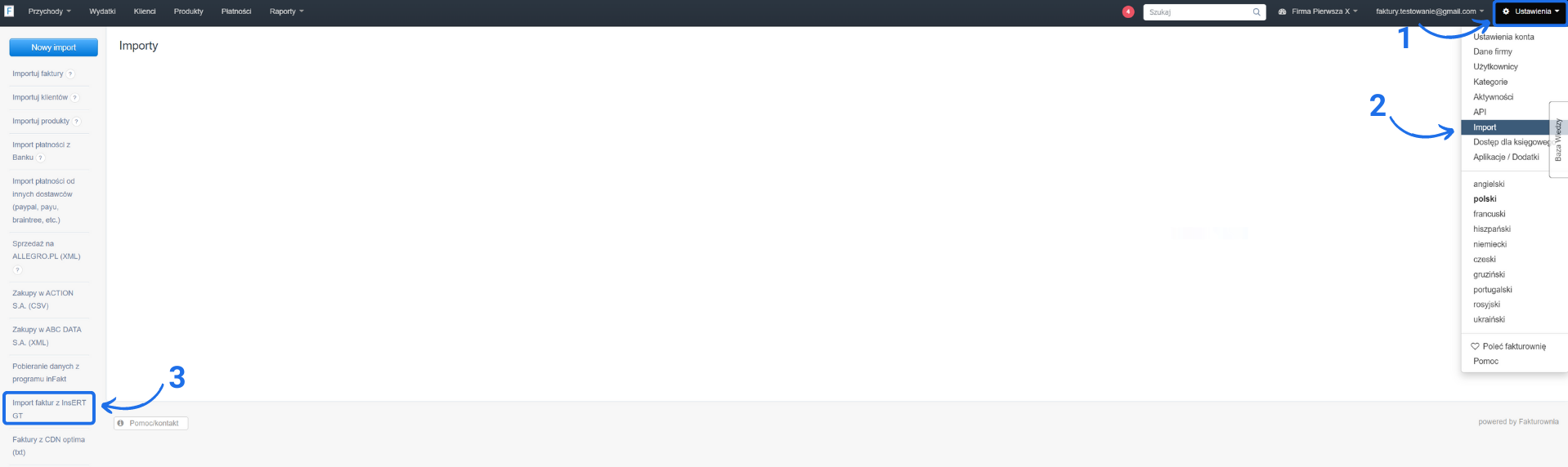 Aby zaimportować dane z programu InsERT (dawny Subiekt GT) do Fakturowni:- przejdź do zakładki Ustawienia > Import > Import faktur z InsERT GT;
