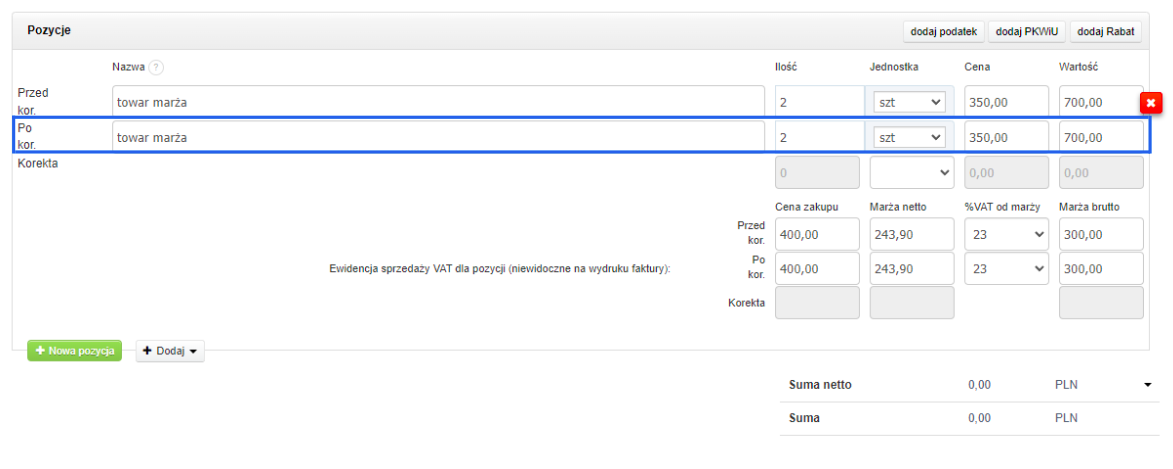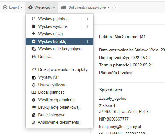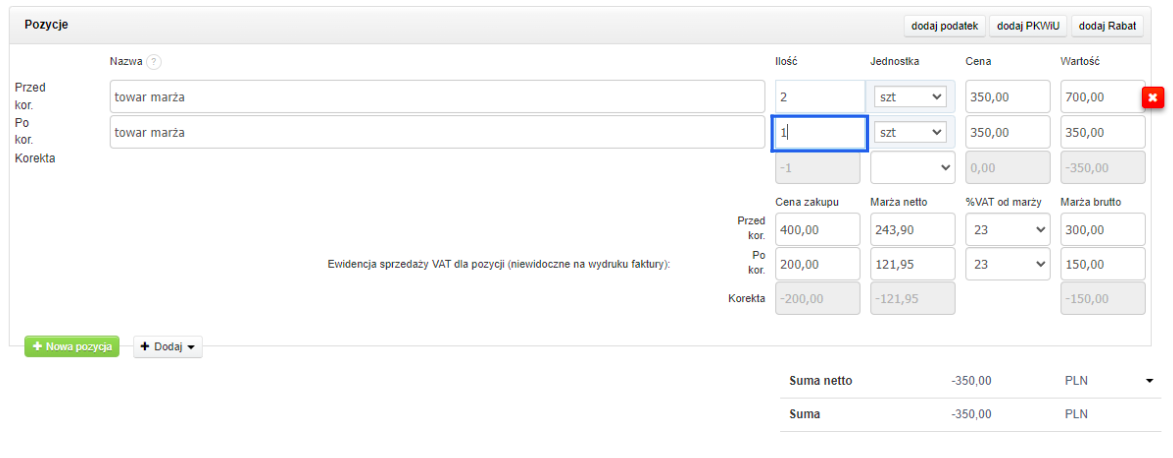 W przypadku stwierdzenia błędu na wystawionej w procedurze VAT marża fakturze sprzedaży, aby prawidłowo odzwierciedlić dokonaną transakcję, należy wystawić fakturę korygującą. Wejdź w fakturę, którą zamierzasz skorygować. Będąc w widoku faktury, z menu w lewym górnym rogu wybierz Więcej opcji > Wystaw korektę: Możesz wpisać przyczynę korekty, zostanie ona wówczas naniesiona na wydruku faktury: Szablon automatycznie podpowiada wartości widniejące na pierwotnej fakturze: ​​​​​​Drugi wiersz zawiera dane po korekcie. To w nim należy wskazać prawidłowe wartości sprzedaży. Na przykładzie poniżej, zaznaczono miejsce zmiany – zmiana dotyczyła wyłącznie ilości sztuk – wszystkie pozostałe wartości system wyliczył automatycznie. ​​​​​​Wystawiony dokument faktury korygującej wygląda następująco: ​​​​​​Wprowadzone dane zostaną automatycznie zaewidencjonowane do rejestru sprzedaży VAT i przeniesione do pliku JPK_V7, jeśli korzystasz. Aby wyświetlić dane księgowe dokumentu, skorzystaj ponownie z menu w lewym górnym rogu, wybierając tym razem Więcej opcji > Dane księgowe: ​​​​​​Możesz sprawdzić lub edytować kwoty lub kody procedur wprowadzone do rejestru. Jak poprawić dane, używając edycji zaawansowanej, dowiesz się z artykułu: Rejestry VAT – edycja zaawansowana