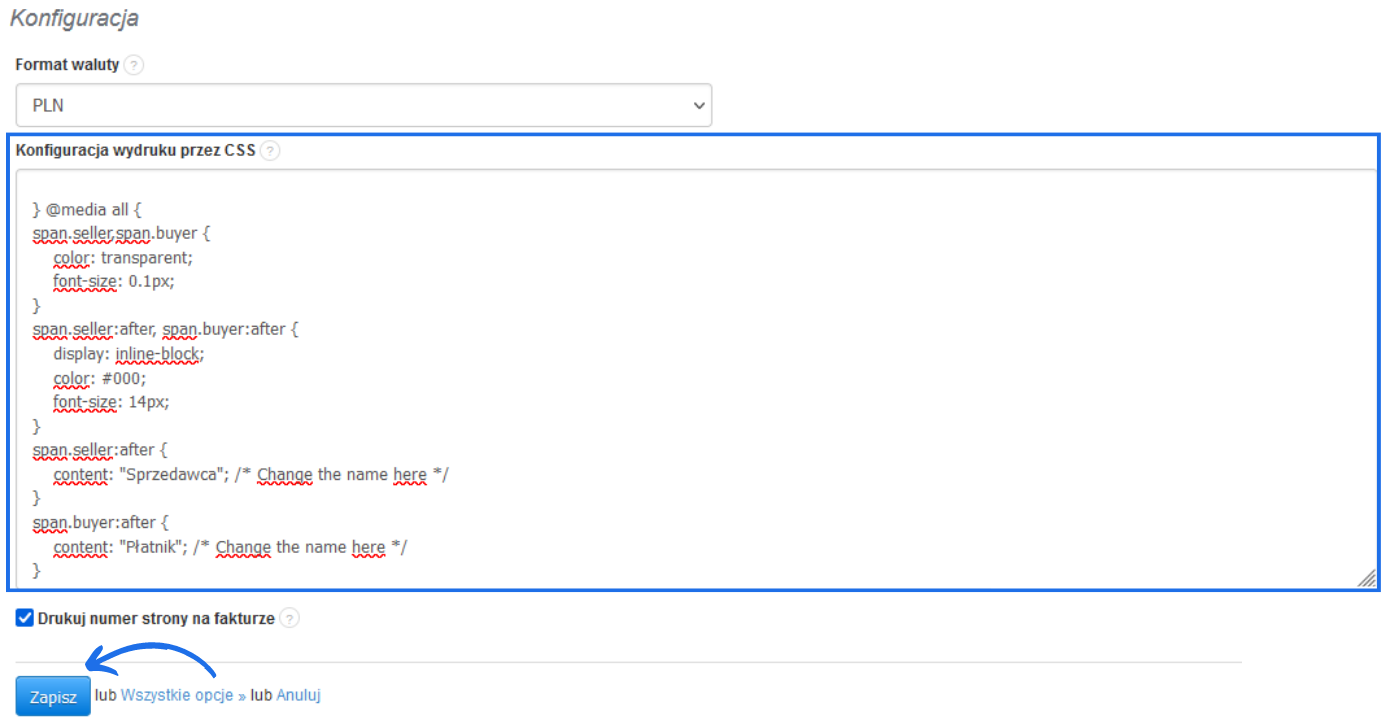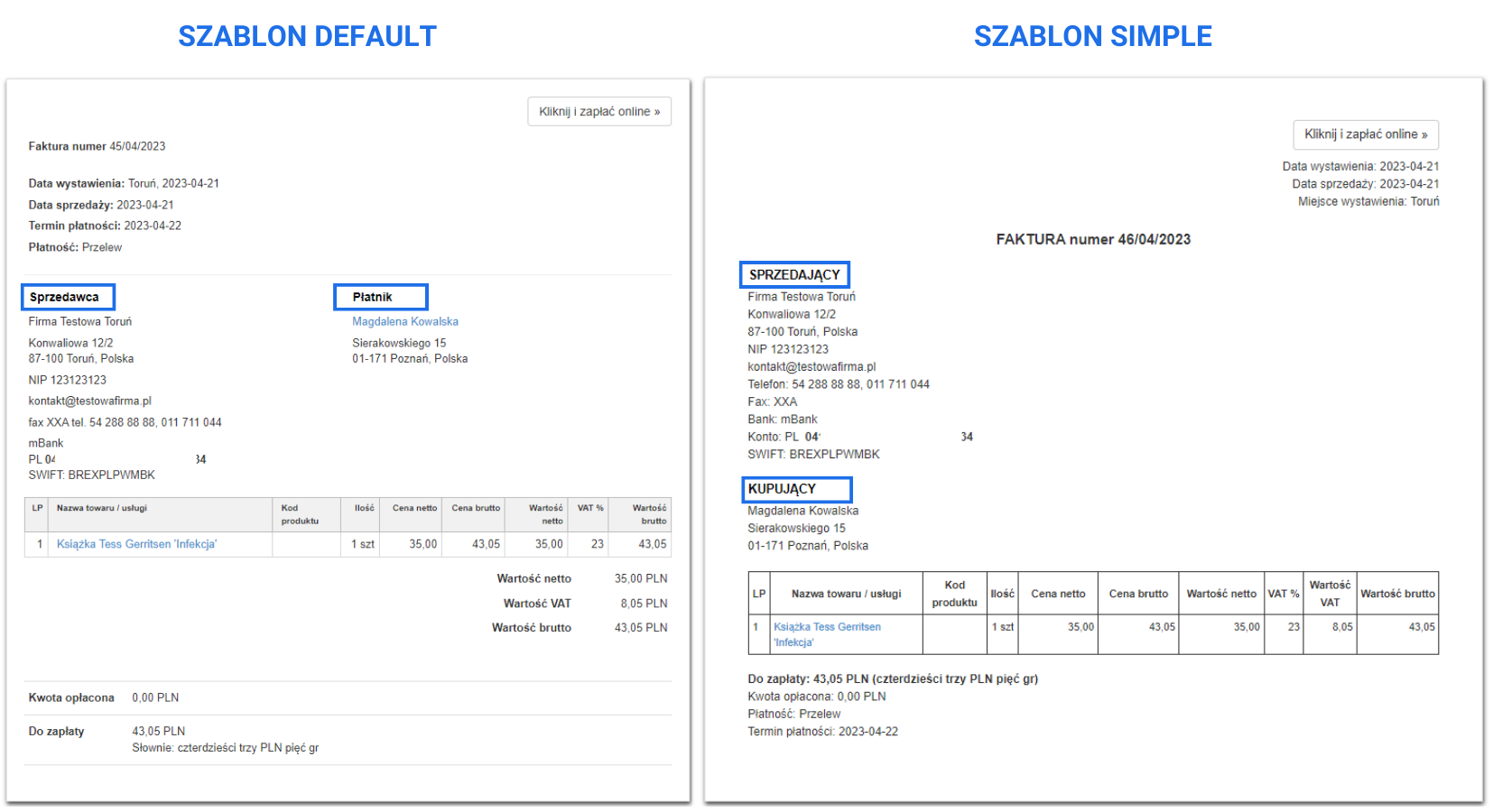 Poniżej przykład faktur po zastosowaniu kodu CSS, który zmienia nazwę sprzedającego i kupującego towar lub usługę.