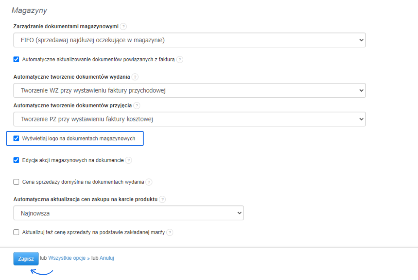 - zaznacz checkbox przy opcji Wyświetlaj logo na dokumentach magazynowych,