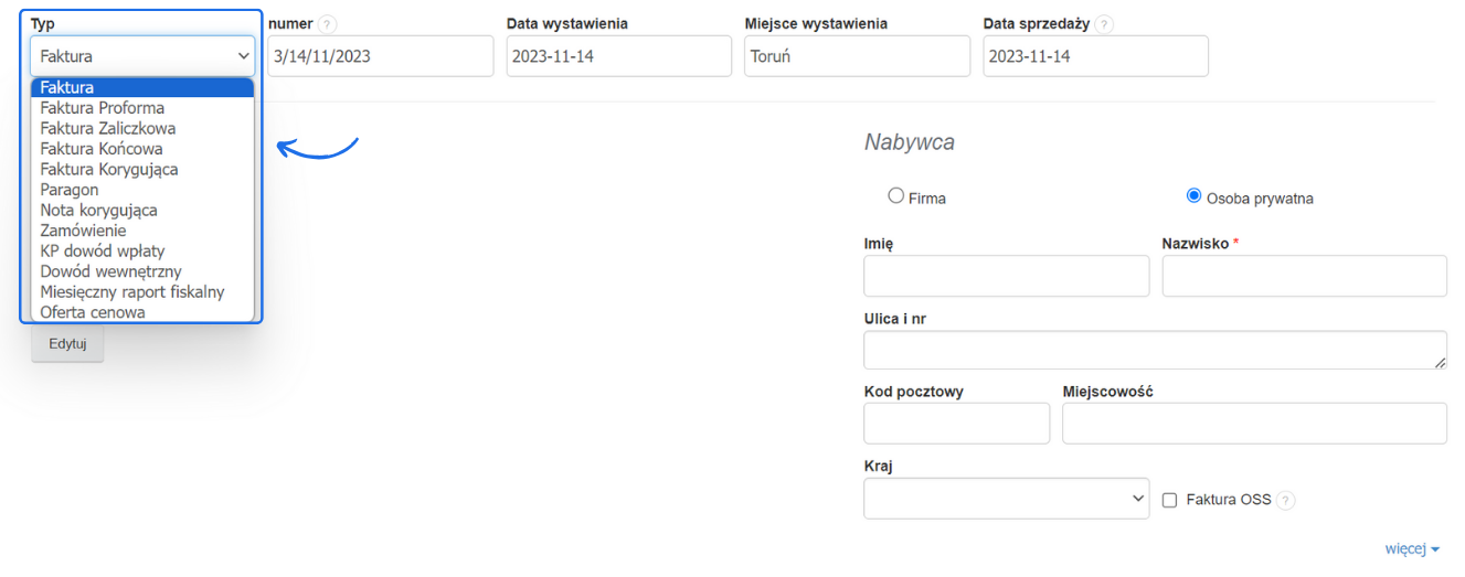 - kliknięcie w tę rubrykę daje możliwość zmiany typu dokumentu poprzez wybranie go z wyświetlonej listy (na liście dostępne będą te dokumenty, które są aktywne w sekcji Jakie dokumenty wystawiać)