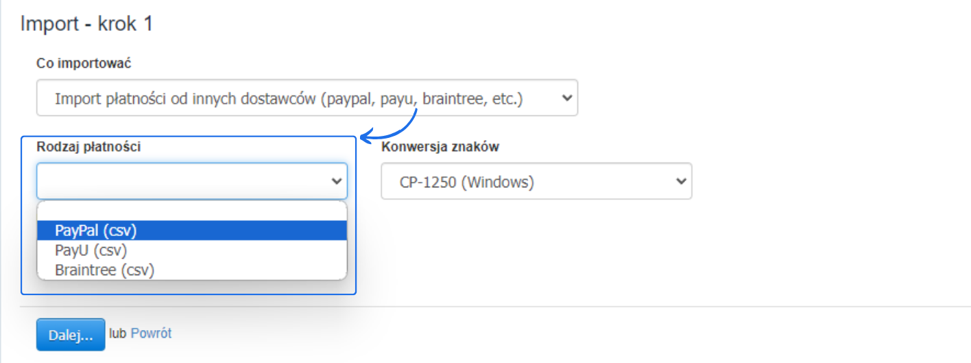 - z belki po lewej stronie wybierz opcję Import płatności od innych dostawców (paypal, payu, braintree, etc.),