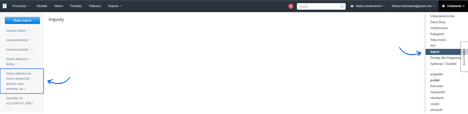 Aby zaimportować płatności od innych dostawców: .- przejdź do zakładki Ustawienia > Import,