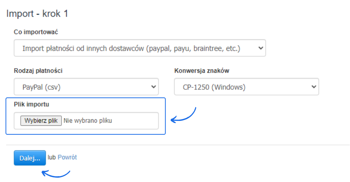 - wgraj plik korzystając z przycisku Wybierz plik w rubryce Plik importu i zatwierdź przejście do kolejnego kroku klikając Dalej,