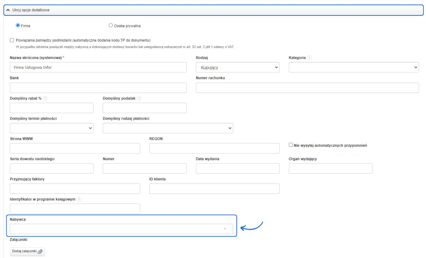 - przejdź do zakładki Zobacz więcej opcji (lub Ukryj opcje dodatkowe jeśli już rozwinięte) i znajdź rubrykę Nabywca;