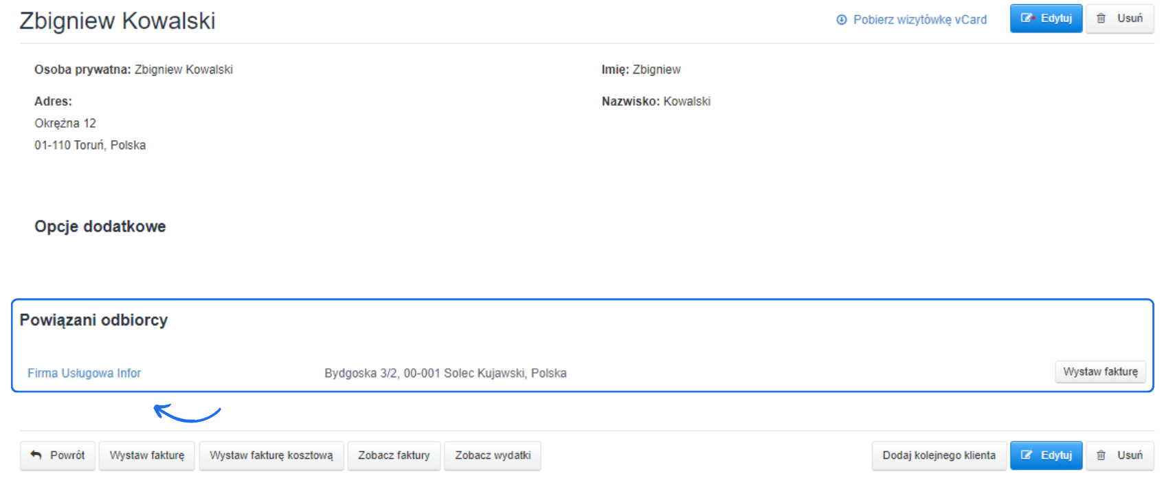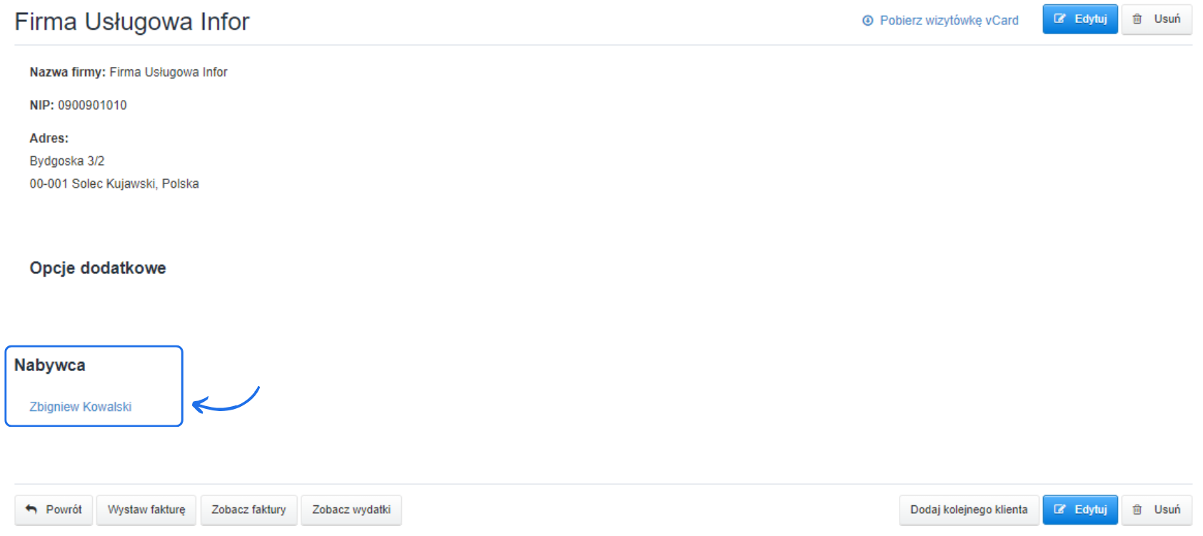 - stwórz nowego klienta za pomocą przycisku Dodaj klienta lub kliknij nazwę klienta dostępnego na liście i skorzystaj z opcji edycji,
