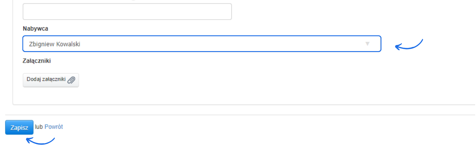 - wpisz początek nazwy klienta, którego dodasz jako nabywcę i z wyświetlonej listy wybierz klienta, który ma być Nabywcą - pojawi się on w dedykowanej rubryce,