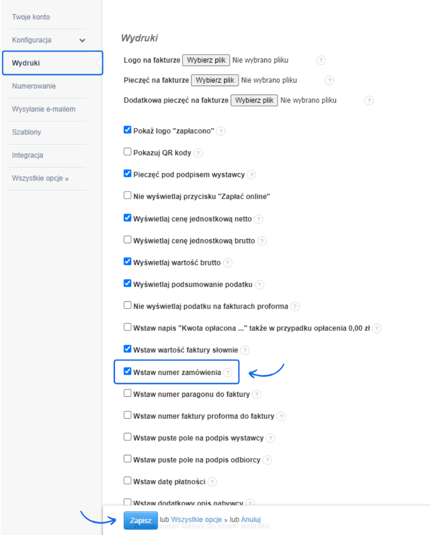 - zaznacz checkbox przy opcji Wstaw numer zamówienia,