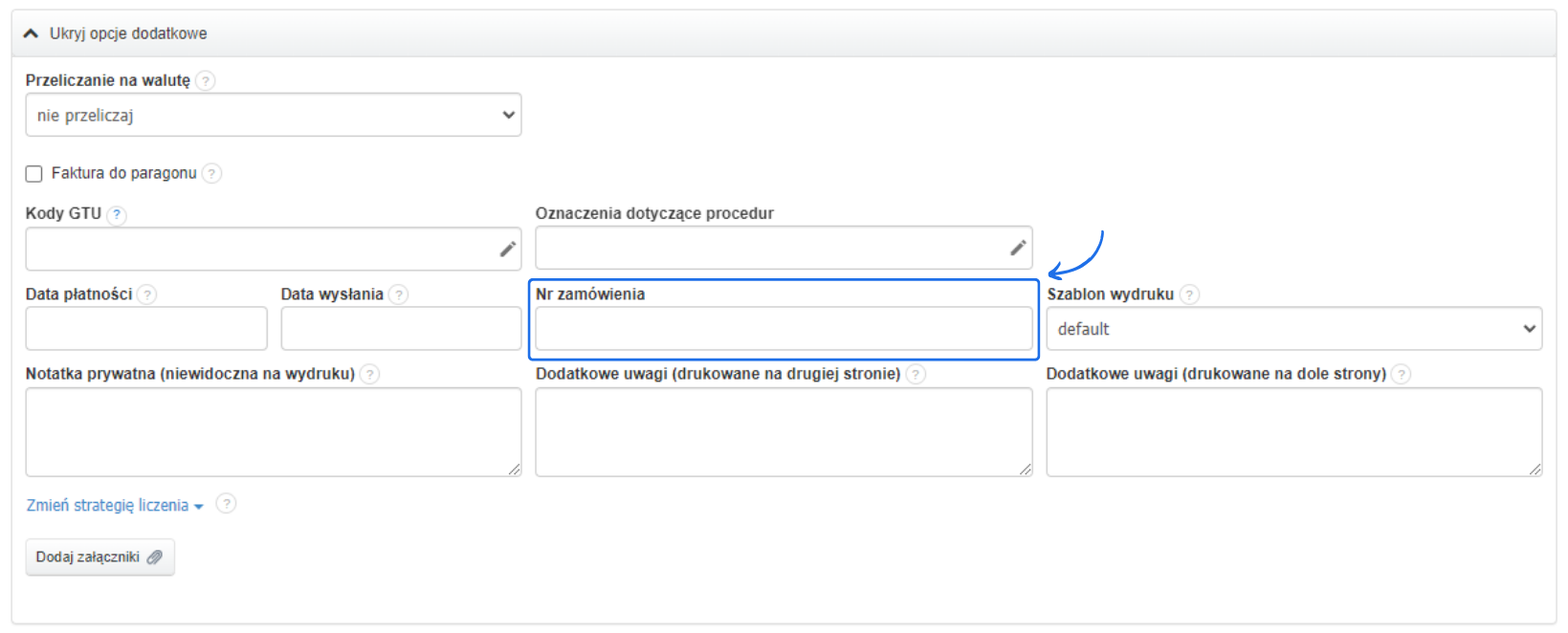 Rubryka Nr zamówienia dostępna jest na formularzu tworzenia/edycji dokumentu. Po rozwinięciu sekcji Zobacz więcej opcji (Ukryj opcje dodatkowe, jeśli już rozwinięte), znajdziesz dedykowaną rubrykę do podania numeru zamówienia. Po wpisaniu wartości w tę rubrykę, pojawi się ona na wydruku dokumentu, jeśli w ustawieniach konta aktywne jest wyświetlanie numeru zamówienia.