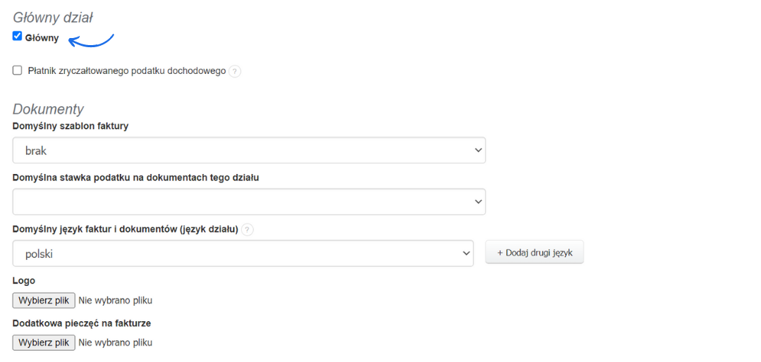 Jeśli na koncie w Fakturowni masz kilka firm lub działów, a sprzedaż z Allegro chcesz przyporządkować jednemu z nich, daną firmę czy dział musisz ustawić najpierw jako główny. Aby ustawić dział jako główny: