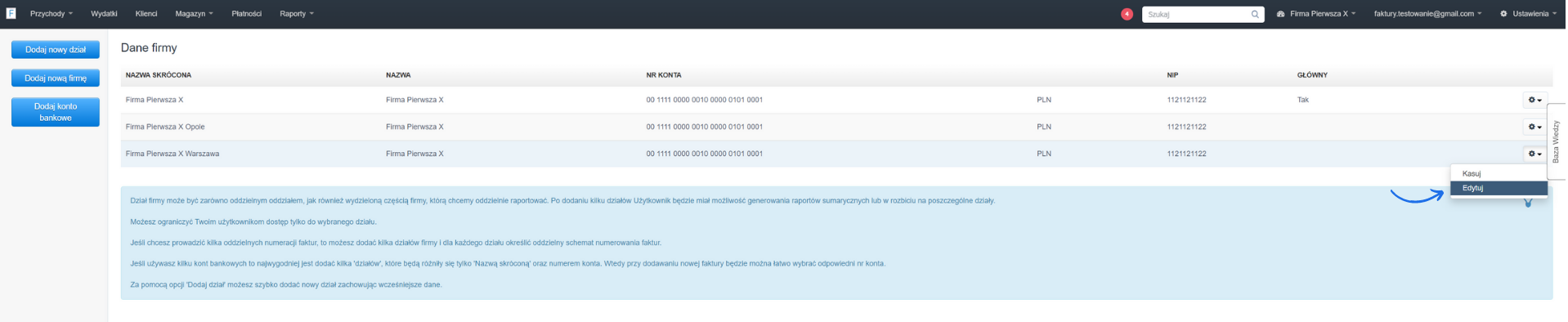 - przy pomocy kółka zębatego naciśnij przycisk Edytuj przy wybranym dziale/firmie;