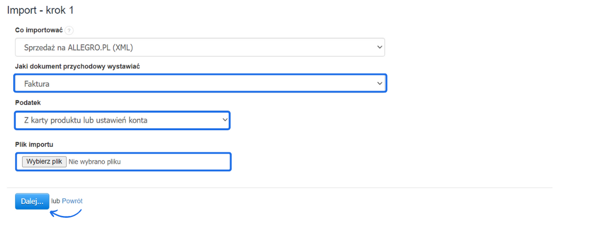 - korzystając z przycisku Wybierz plik wgraj plik importu i przejdź do kolejnego kroku klikając Dalej;