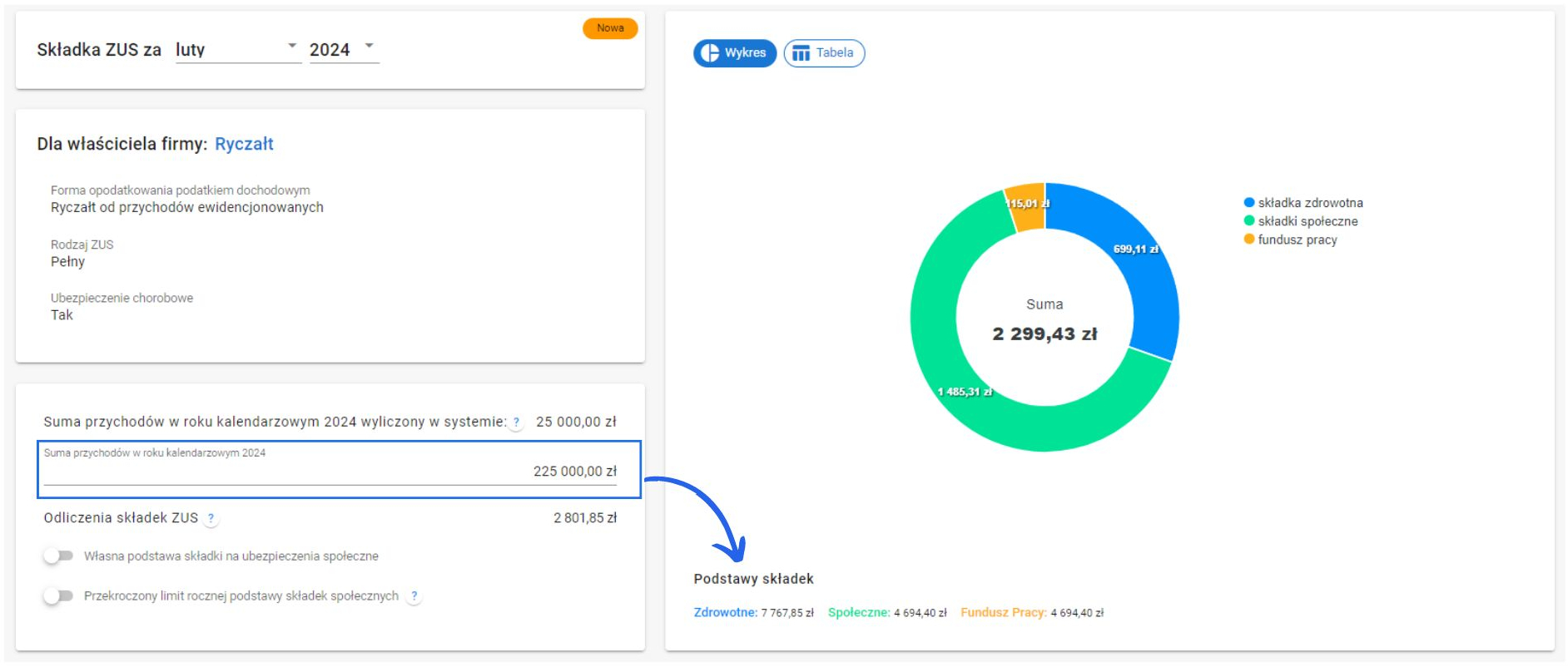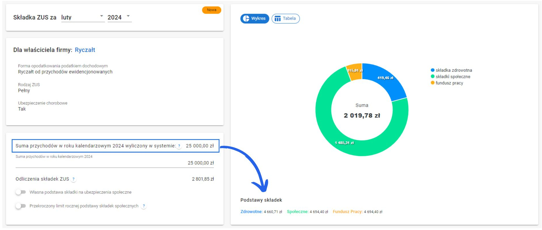 System, na podstawie zarejestrowanych dokumentów, automatycznie wylicza twój przychód i przysługujące Ci odliczenia składek społecznych, narastająco od początku roku. Na tej podstawie ustala odpowiednią podstawę składki zdrowotnej. Dla przykładu poniżej to 60% przeciętnego miesięcznego wynagrodzenia.
