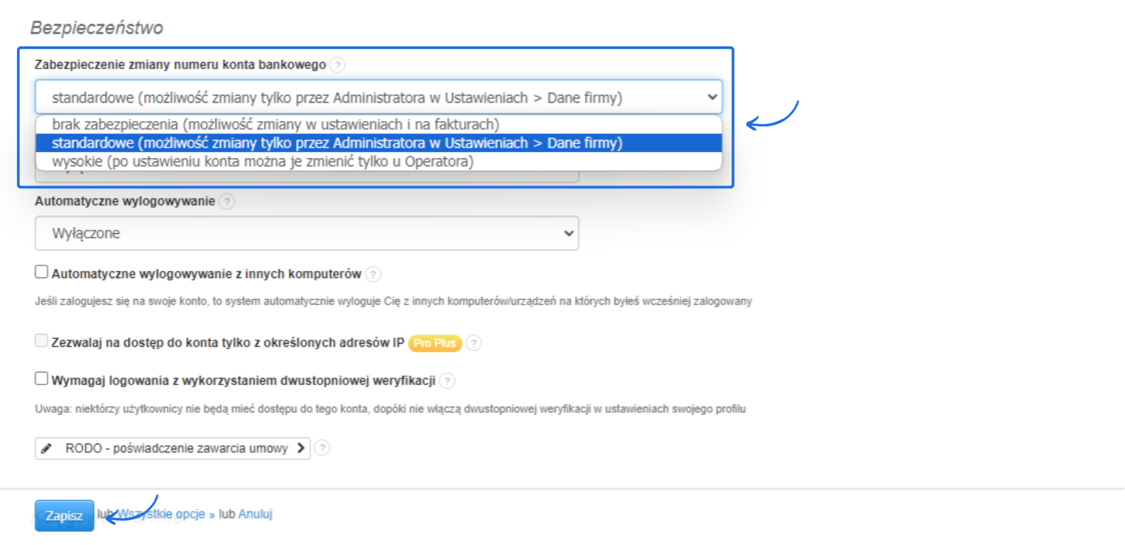 - znajdź pole Zabezpieczenie zmiany numeru konta bankowego i dokonaj wyboru jednej z trzech dostępnych opcji;