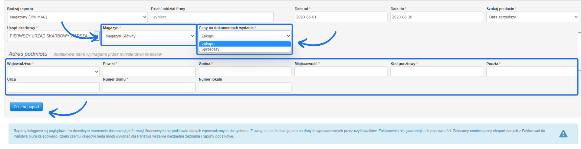 Zwróćmy uwagę, że wśród parametrów raportu nie mamy już rubryki Waluta. Zgodnie z przeznaczeniem pliku kontrolnego związanego z obrotem magazynowym waluta, w której powinien być rozliczony magazyn to rodzima waluta, czyli PLN. Walutę rozliczenia magazynu, innych raportów w systemie oraz listy faktur możemy dostosować, ustawiając walutę główną konta w zakładce Ustawienia> Ustawienia konta> Waluta.Okres wygenerowania pliku