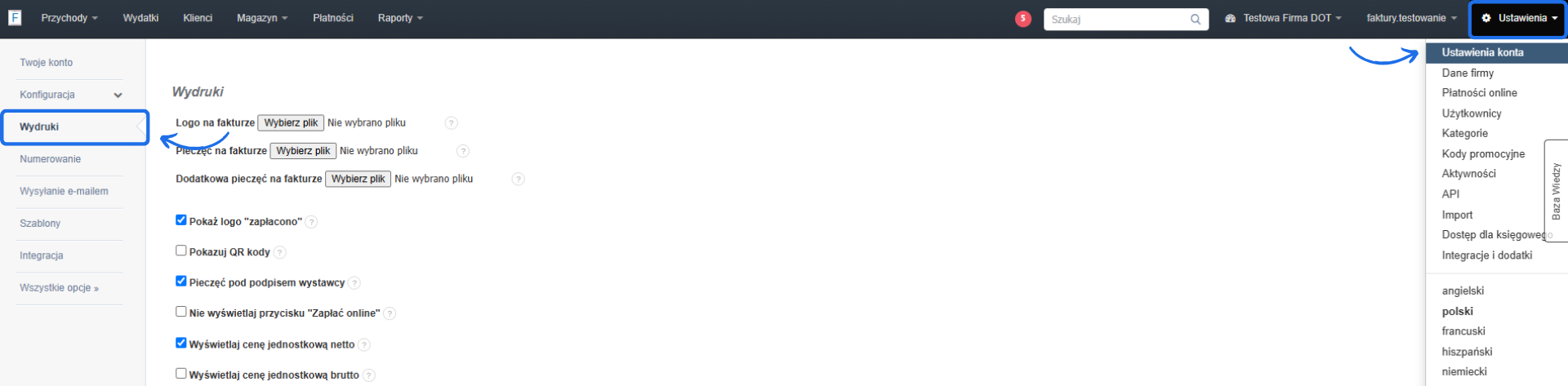 Domyślnie, jeśli w formularzu tworzenia faktury uzupełnisz pola Imię i nazwisko wystawcy oraz Imię i nazwisko odbiorcy, pojawią się one na dokumencie jak na widoku poniżej.- przejdź do zakładki Ustawienia > Ustawienia konta > Wydruki,