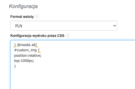 Aby zmienić element faktury na wydruku, przejdź do menu Ustawienia > Wydruki, a następnie na dole strony wypełnij pole Konfiguracja wydruku przez CSS (wedle schematu jak poniżej):