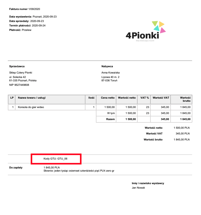 Jeżeli chcesz, aby kod był drukowany na dokumencie, przejdź do menu Ustawienia > Ustawienia konta > Wydruki i zaznacz pole Wstaw kody GTU. Możliwe do wstawienia są również kody procedur poprzez zaznaczenie okna Wstaw oznaczenia dotyczące procedur. Oznaczenia są niezależne względem siebie. Wybrane na dokumencie kody GTU oraz kody procedur będą wyświetlone poniżej pola "Uwagi na fakturze".