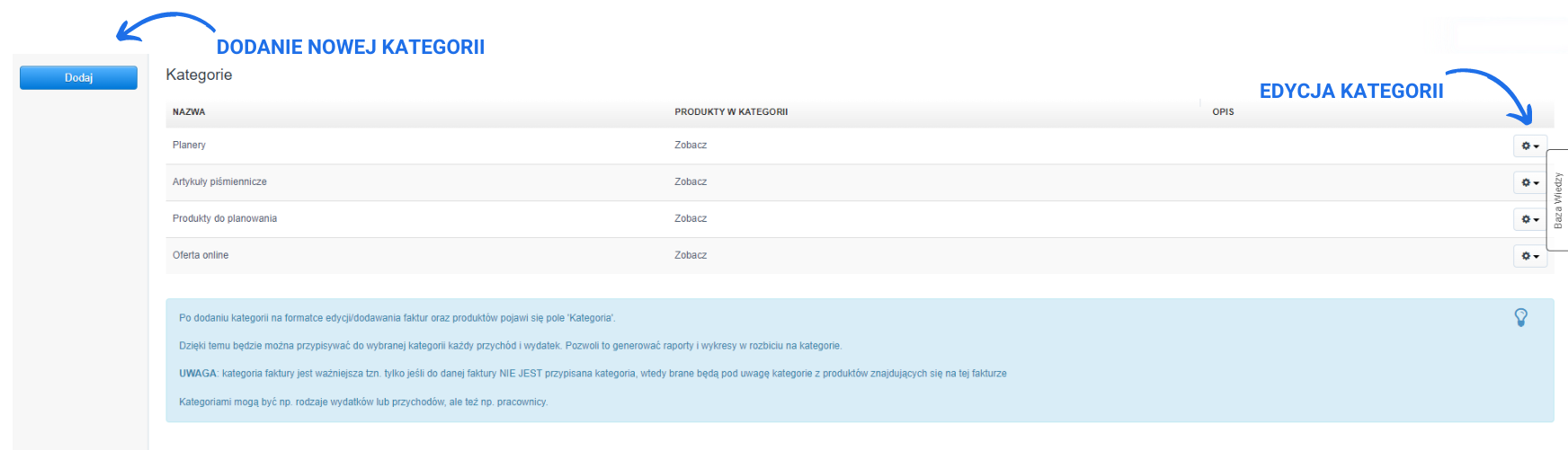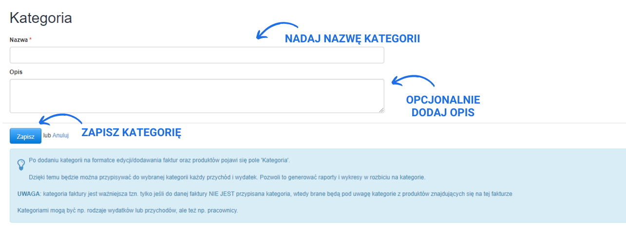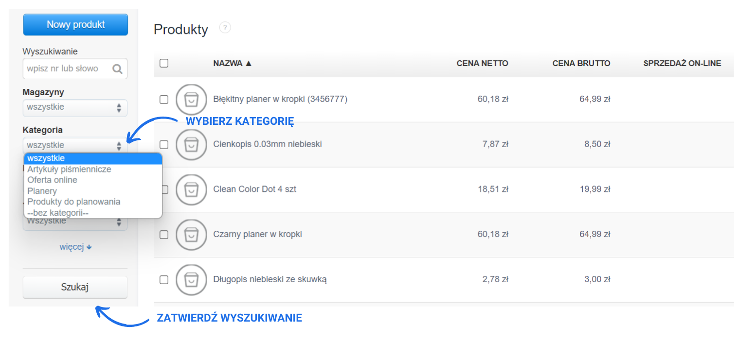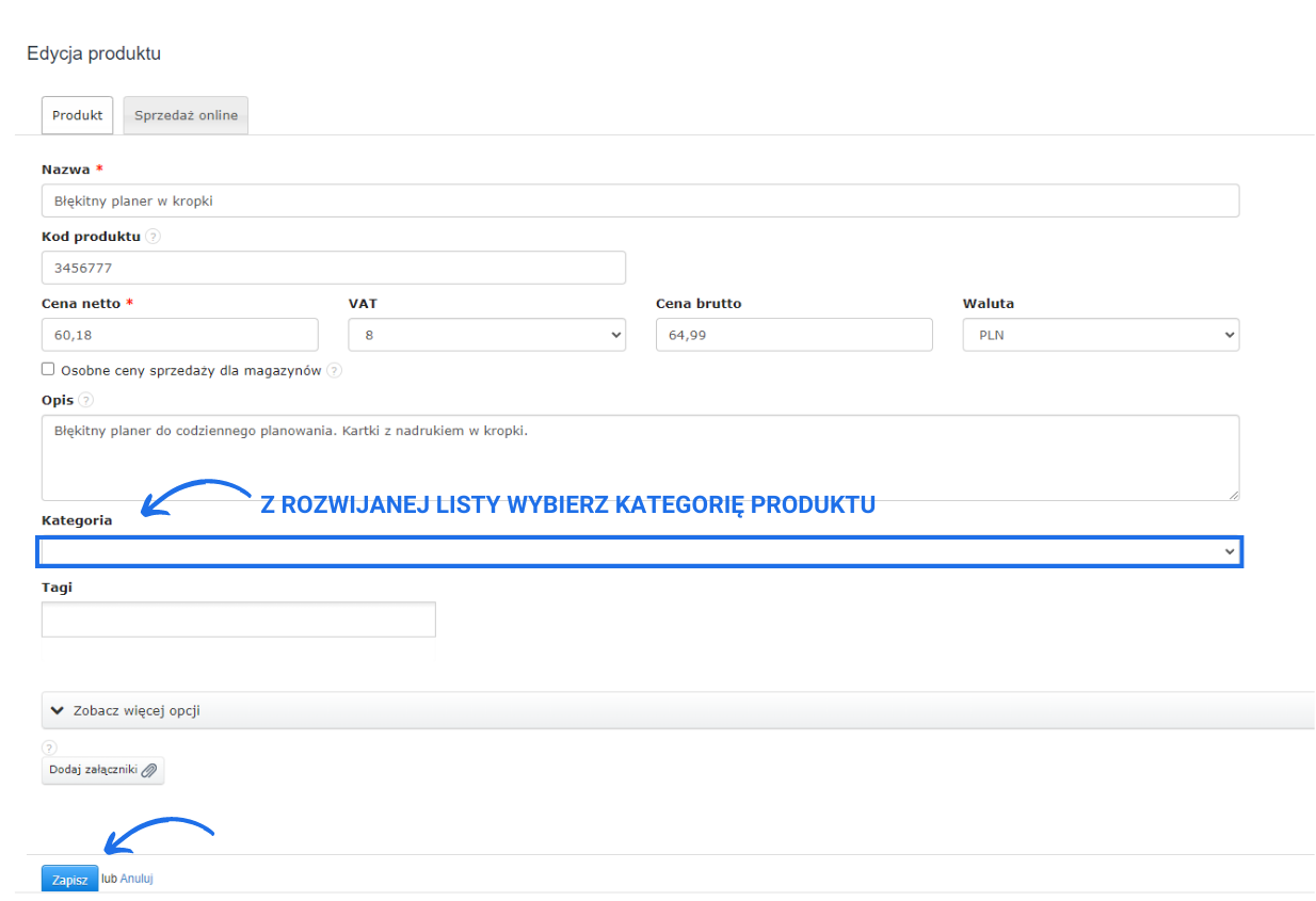 Dodawanie produktów do odpowiedniej kategorii odbywa się następująco. Zaczynamy od stworzenia odpowiedniej kategorii wchodząc w zakładkę Ustawienia > Kategorie > Dodaj nową. Po kliknięciu Dodaj, dla kategorii ustal nazwę, opcjonalnie dodaj opis kategorii i zatwierdź jej utworzenie klikając Zapisz. Następnie wejdź w zakładkę Magazyn > Produkty i dodaj nowy produkt bądź edytuj istniejący. Kategorie nadajemy z poziomu karty produktu wybierając ją z rubryki Kategoria. Wprowadzone zmiany zatwierdź klikając Zapisz. O tego momentu produkt ma przypisaną kategorię. Bardzo szybko możesz odnaleźć na liście produktów w danym magazynie produkty, które przypisane są do danej kategorii. Wystarczy w tym celu użyć filtra Kategoria znajdującego się w panelu bocznym zakładki Produkty.